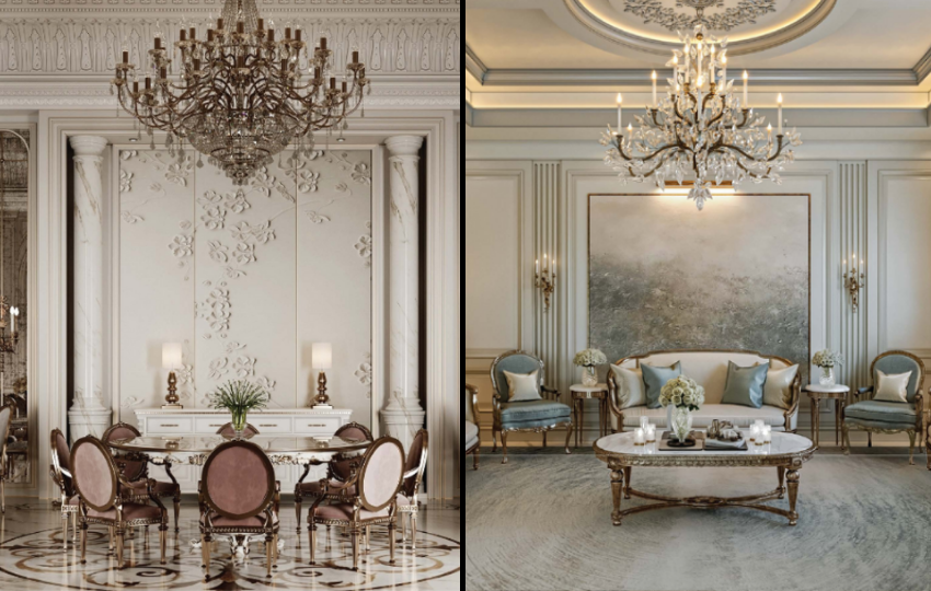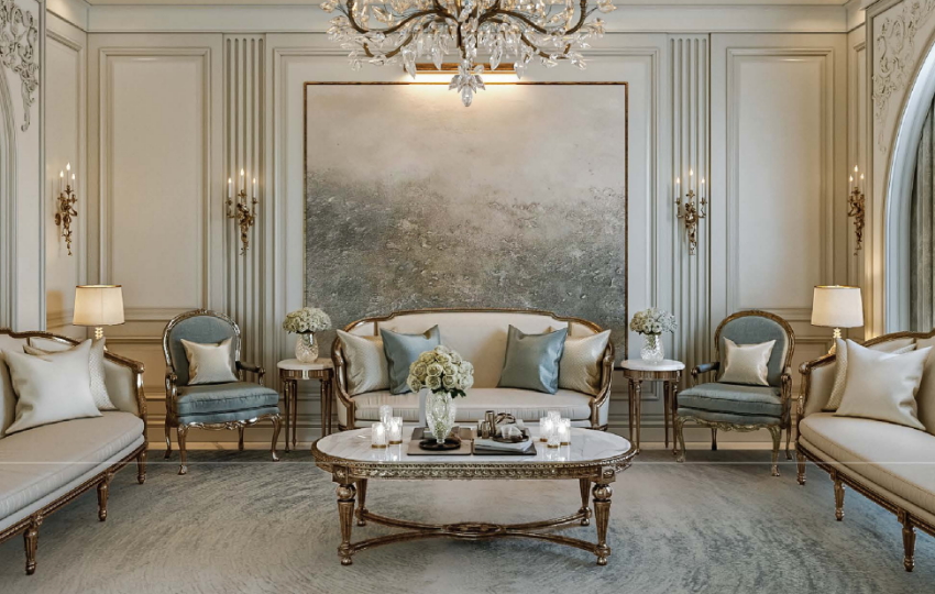The design evokes a sense of timeless refinement through soft hues, elegant detailing, and natural light that gently illuminates every curve and contour. Each element — from the ornate chandelier to the sculpted wall moldings — is curated to express sophistication without excess.