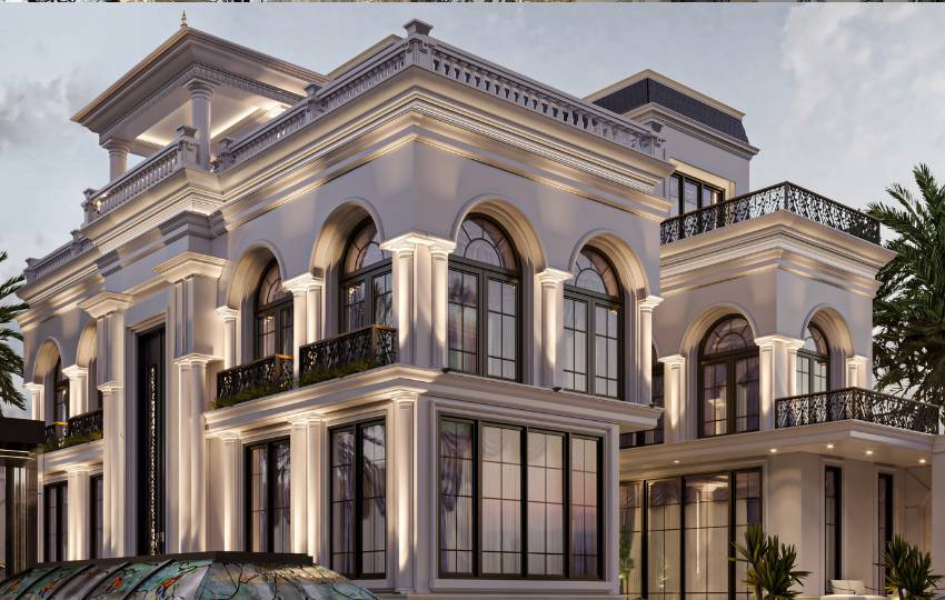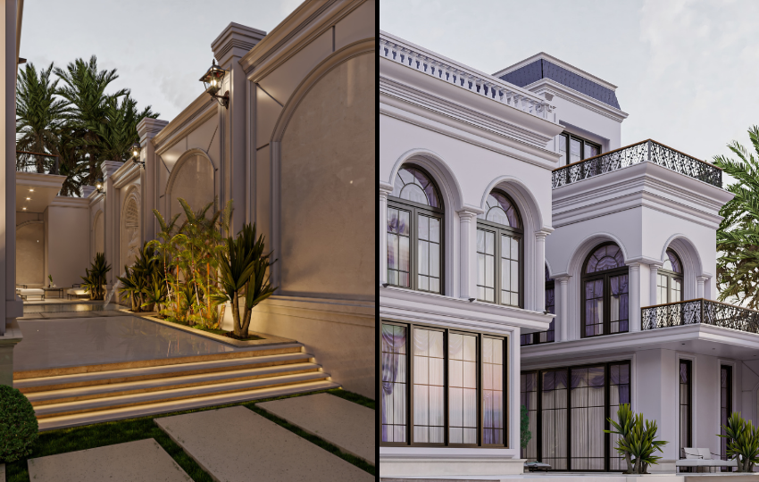 Soft ambient lighting accentuates the villa’s vertical rhythm and ornamental depth, transforming its presence from day to night. The design captures the essence of timeless sophistication — where architecture becomes a reflection of lifestyle, taste, and identity.