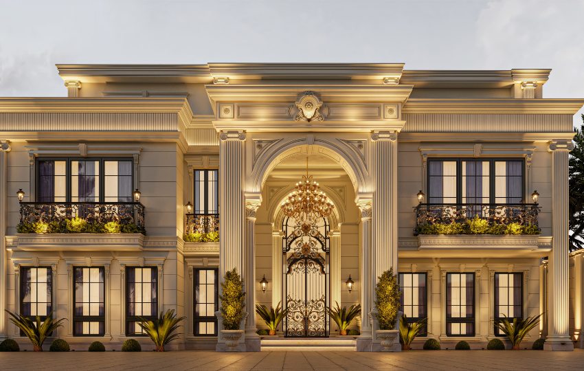 Soft golden lighting enhances the façade’s sculptural depth, casting a warm glow that transforms the villa into a beacon of luxury at twilight. Every element — from the chandelier crowning the entrance to the symmetry of the windows and balconies — reflects an unspoken dialogue between architecture and artistry.