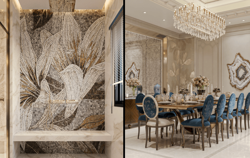 Rooted in neoclassical principles, the design blends symmetry, proportion, and opulent detailing with a modern sense of softness. The grand salon — defined by its crystal chandeliers, rich wood paneling, and hand-crafted furniture — creates an atmosphere of prestige and warmth.