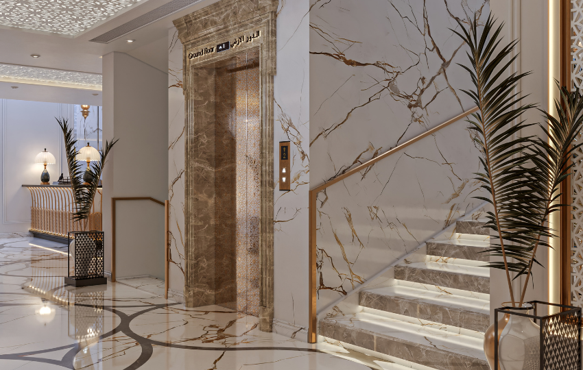 التصميم يوازن بين الفخامة والراحة، ويخلق رحلة بصرية تبدأ من لحظة دخول الضيف وحتى وصوله إلى غرفته، بحيث يشعر بالترحيب والانبهار في آن واحد.